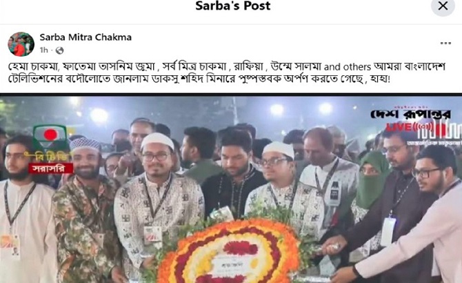 পোস্টে ক্ষোভ নিয়ে সর্ব মিত্র লিখেছেন, ‘হেমা চাকমা, ফাতেমা তাসনিম জুমা, সর্ব মিত্র চাকমা, রাফিয়া, উম্মে সালমা and others আমরা বাংলাদেশ টেলিভিশনের বদৌলোতে জানলাম ডাকসু শহীদ মিনারে পুষ্পস্তবক অর্পণ করতে গেছে, হাহা!’