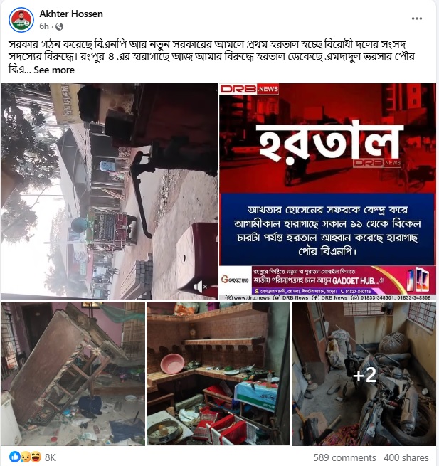 এদিকে আজ ভোররাতে সামাজিক যোগাযোগ মাধ্যম ফেসবুকে আখতার হোসেন একটি দীর্ঘ স্ট্যাটাস দেন। সেখানে তিনি নির্বাচন পরবর্তী হারাগাছে এনসিপির নেতাকর্মীদের ওপর হামলা, বাড়িঘর ভাঙচুর এবং ভয়ভীতির তুলে ধরেন। এই পোস্টে তিনি নির্বাচনের দিনে বিভিন্ন কেন্দ্রে তার পক্ষে থাকা শাপলা কলির কর্মী-সমর্থক এবং পোলিং এজেন্টদের ওপর নানা অন্যায় করা হয়েছে বলে অভিযোগ করেছেন।