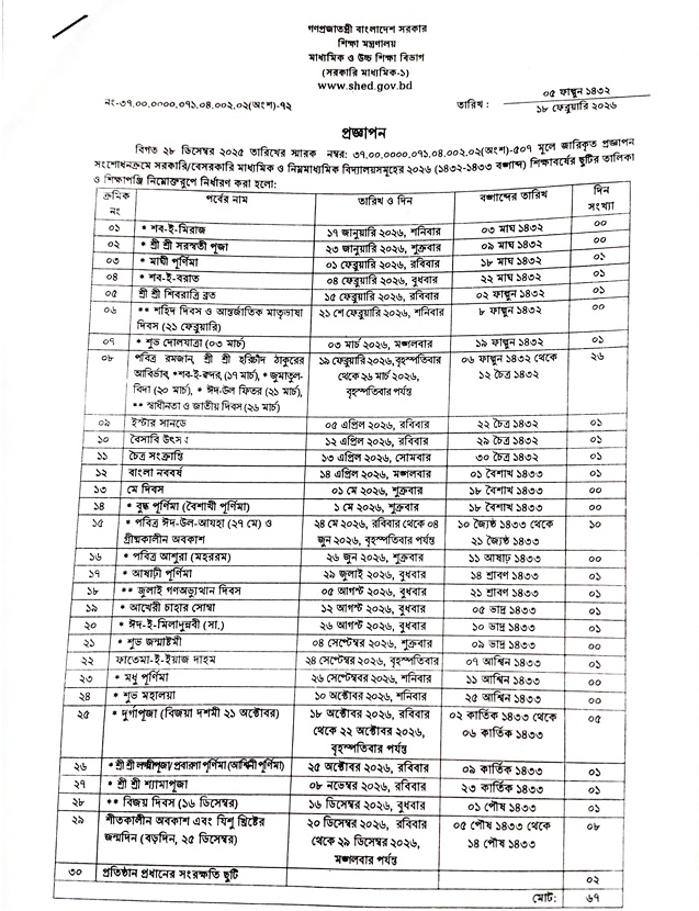 সংশোধিত ছুটির পূর্ণাঙ্গ তালিকা শিক্ষা মন্ত্রণালয়ের অফিসিয়াল ওয়েবসাইটে প্রকাশ করা হয়েছে।