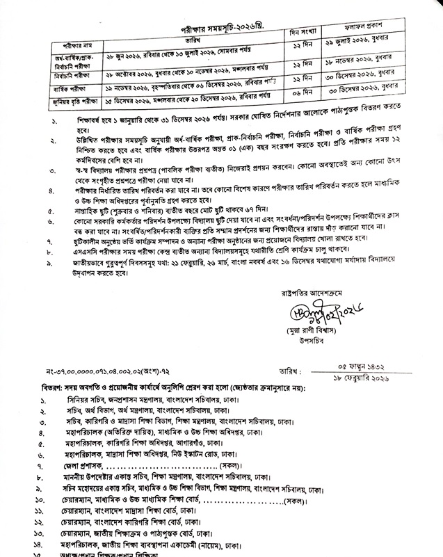 মন্ত্রণালয়ের প্রকাশিত তালিকা অনুযায়ী, শিক্ষাপ্রতিষ্ঠানগুলোর বার্ষিক ছুটি, বিভিন্ন জাতীয় দিবস, ধর্মীয় উৎসব এবং একাডেমিক কার্যক্রমের সময়সূচিতে কিছু পরিবর্তন আনা হয়েছে। সংশ্লিষ্ট বিদ্যালয়গুলোকে নতুন তালিকা অনুযায়ী শিক্ষা কার্যক্রম পরিচালনার নির্দেশনা দেওয়া হয়েছে।