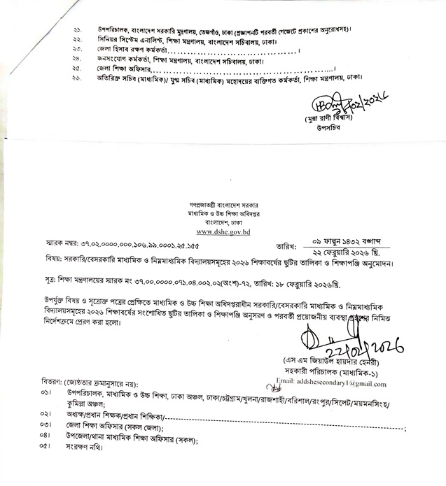 সরকারি ও বেসরকারি মাধ্যমিক এবং নিম্নমাধ্যমিক বিদ্যালয়ের ছুটির তালিকা আবারও সংশোধন করা হয়েছে। সংশোধিত ছুটির তালিকা প্রকাশ করেছে সরকার।