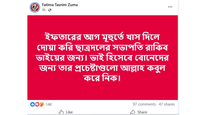 ফেসবুক পোস্টে জুমা লেখেন, ‘ইফতারের আগ মুহূর্তে খাস দিলে দোয়া করি ছাত্রদলের সভাপতি রাকিব ভাইয়ের জন্য। ভাই হিসেবে বোনদের জন্য তার প্রচেষ্টাগুলো আল্লাহ কবুল করে নিক।’