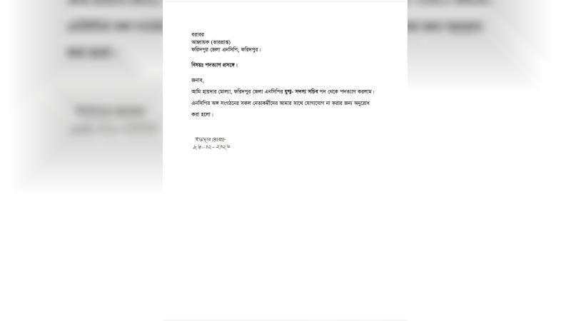 পদত্যাগপত্রে তিনি লিখেছেন, “আমি হায়দার মোল্যা, ফরিদপুর জেলা এনসিপির যুগ্ম-সদস্য সচিব পদ থেকে স্বেচ্ছায় পদত্যাগ করছি।” পাশাপাশি দলের অঙ্গ ও সহযোগী সংগঠনের নেতাকর্মীদের প্রতি ব্যক্তিগতভাবে যোগাযোগ না করার অনুরোধও জানিয়েছেন তিনি। তার এ ঘোষণায় স্থানীয় রাজনৈতিক অঙ্গনে নানা আলোচনা সৃষ্টি হয়েছে।