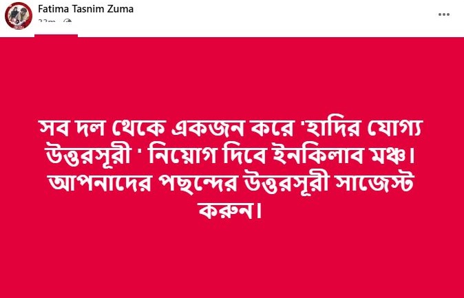 ফেসবুক পোস্টে তিনি বলেন, ‘সব দল থেকে একজন করে ‘হাদির যোগ্য উত্তরসূরি’ নিয়োগ দিবে ইনকিলাব মঞ্চ। আপনাদের পছন্দের উত্তরসূরি সাজেস্ট করুন।’
