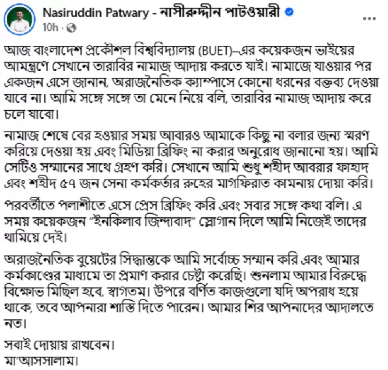 “বুয়েটে কয়েকজন শিক্ষার্থীর আমন্ত্রণে আমি তারাবির নামাজ পড়তে যাই। নামাজে যাওয়ার পর একজন শিক্ষার্থী আমাকে জানিয়ে দেন যে, অরাজনৈতিক ক্যাম্পাসে কোনো বক্তব্য দেওয়া যাবে না। আমি তা সম্মান জানিয়ে নামাজ শেষ করে চলে আসি। বের হওয়ার সময় আমাকে আবার কিছু না বলার জন্য এবং মিডিয়া ব্রিফিং না করার জন্য অনুরোধ করা হয়, যা আমি সম্মানের সঙ্গে গ্রহণ করি। আমি সেখানে শহীদ আবরার ফাহাদ ও শহীদ ৫৭ জন সেনা কর্মকর্তার রূহের মাগফিরাত কামনা করে দোয়া করি। পরে পলাশীতে এসে প্রেস ব্রিফিং করি এবং সবার সঙ্গে কথা বলি। কেউ “ইনকিলাব জিন্দাবাদ” স্লোগান দিলে আমি নিজেই তাদের থামিয়ে দিই।”