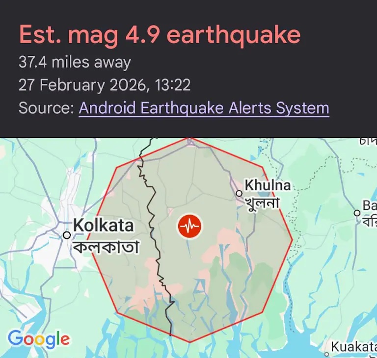 ভারতের পশ্চিমবঙ্গ রাজ্যের রাজধানী ‘সিটি অব জয়’ খ্যাত কলকাতায় শুক্রবার (২৭ ফেব্রুয়ারি) তীব্র ভূকম্পন অনুভূত হয়েছে। এতে স্থানীয় অনেকেই আতঙ্কিত হয়ে পড়েন।