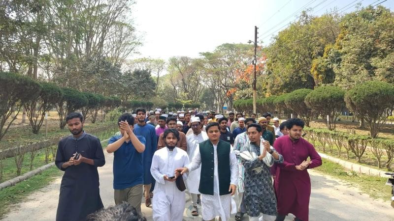 শুক্রবার (২৭ ফেব্রুয়ারি) দুপুরে বিশ্ববিদ্যালয়ের কেন্দ্রীয় মসজিদের সামনে থেকে মিছিলটি শুরু হয়ে বিভিন্ন সড়ক প্রদক্ষিণ শেষে প্রধান ফটকে গিয়ে প্রতিবাদ সমাবেশে মিলিত হয়। এসময় বিশ্ববিদ্যালয় শাখা ছাত্রশিবির, বৈষম্যবিরোধী ছাত্র আন্দোলন ও ইসলামি ছাত্র আন্দোলনের নেতাকর্মীরাসহ বিভিন্ন বিভাগের শিক্ষার্থীরা অংশ নেন।