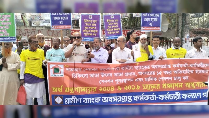 গ্রামীণ ব্যাংক অবসরপ্রাপ্ত কর্মকর্তা- কর্মচারী কল্যাণ পরিষদের ডাকে আজ ২৮শে ফেব্রুয়ারী শনিবার সকাল ১০টায় জাতীয় প্রেসক্লাবের সামনে এক মানববন্ধন ও বিক্ষোভ সমাবেশের আয়োজন করা হয় ৷ মূলত গ্রামীণ ব্যাংকের শতভাগ পেনশন সমর্পনকারী অবসরপ্রাপ্ত কর্মকর্তা কর্মচারীদের গণ প্রজাতন্ত্রী বাংলাদেশ সরকারের মন্ত্রণালয়ের জারিকৃত প্রজ্ঞাপন গ্রামীণ ব্যাংকে বাস্তবায়নের দাবিতে মানববন্ধন ।