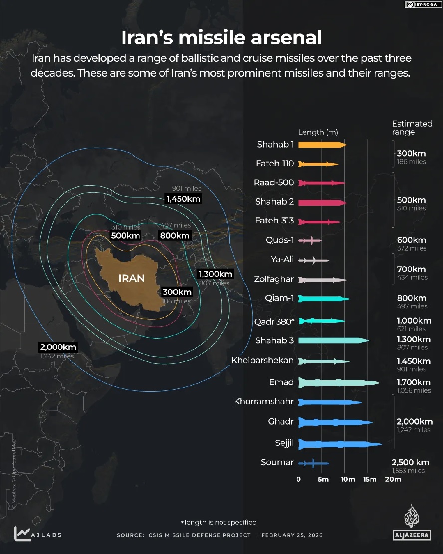 আন্তর্জাতিক গোয়েন্দা প্রতিবেদনে ইরানের ক্ষেপণাস্ত্র সাধারণত ২,০০০ কিমি পর্যন্ত সীমাবদ্ধ বলে বিবেচিত, যা মধ্যপ্রাচ্যের প্রায় সব গুরুত্বপূর্ণ অঞ্চলকে আঘাতের সম্ভাবনা রাখে।