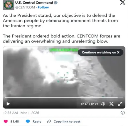 ইরানে শনিবার থেকে হামলা শুরু করেছে যুক্তরাষ্ট্র ও ইসরাইল। হামলায় ইরানের সর্বোচ্চ নেতা আয়াতুল্লাহ আলি খামেনি নিহত হয়েছেন। এ হামলার ভিডিও প্রকাশ করেছে মার্কিন সেন্ট্রাল কমান্ড।