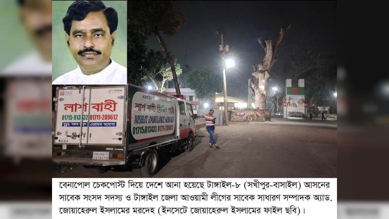 বেনাপোল আন্তর্জাতিক চেকপোস্ট (আইসিপি) দিয়ে দেশে আনা হয়েছে টাঙ্গাইল-৮ (সখীপুর-বাসাইল) আসনের সাবেক সংসদ সদস্য ও টাঙ্গাইল জেলা আওয়ামী লীগের সাবেক সাধারণ সম্পাদক অ্যাডভোকেট জোয়াহেরুল ইসলামের (৭০) মরদেহ।