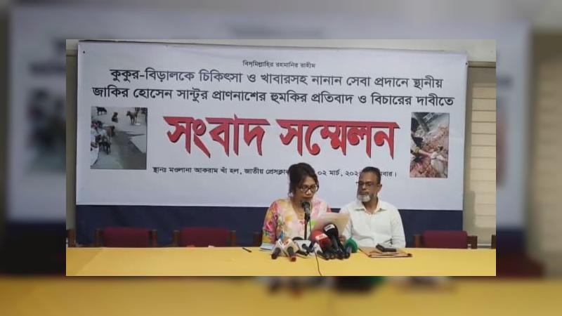 রাজধানীর পশ্চিম ধানমন্ডিতে স্কুলসংলগ্ন বাড়ি ও রাস্তার কুকুর-বিড়ালকে দীর্ঘদিন ধরে চিকিৎসা ও খাবার দিয়ে আসছেন সৈয়দা নাসরিন আক্তার। কিন্তু সম্প্রতি স্থানীয় জাকির হোসেন সান্টু (৫৫) নামের এক ব্যক্তি তার কাজে বাধা দেন। শুধু তাই নয়, নাসরিন আক্তারকে অশ্রাব্য ভাষায় গালিগালাজ করে প্রাণনাশের হুমকিও দেওয়া হয়। এরই প্রেক্ষিতে তিনি জাতীয় প্রেসক্লাবের তৃতীয় তলায় মাওলানা আকরাম খাঁ হলে একটি সংবাদ সম্মেলন করেন।
