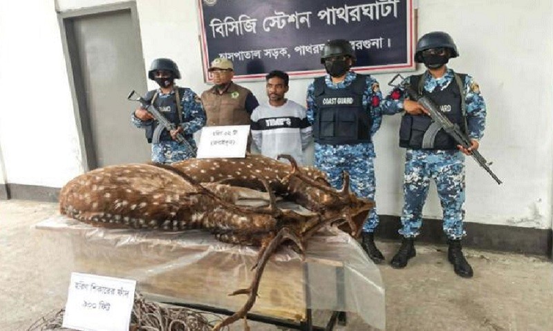 বরগুনার পাথরঘাটা সদর ইউনিয়ন বাদুরতলা খাল থেকে আনুমানিক ৪ মন (১৬০) কেজি ওজনের ২ টি জবাই করা হরিন ও ৯০০ ফিট হরিণ শিকারের ফাঁদসহ মো: হানিফ (৪৫) নামের এক হরিণ শিকারিকে আটক করা হয়েছে। আটক ব্যক্তিকে এক বছর সশ্রম কারাদণ্ড ও ৫০ হাজার টাকা জরিমানা করেছেন ভ্রাম্যমাণ আদালত।