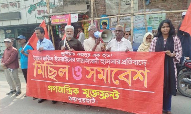 ইরানে মার্কিন-ইসরায়েলি হামলার প্রতিবাদে জয়পুরহাটে গণতান্ত্রিক যুক্তফ্রন্টের একটি মিছিল শহর প্রদক্ষিন শেষে কেন্দ্রীয় মসজিদ চত্বরে এক সমাবেশের আয়োজন করে। ইরানে মার্কিন-ইসরায়েলি হামলার তীব্র প্রতিবাদ জানিয়ে বক্তব্য রাখেন জেলা গণতান্ত্রিক যুক্তফ্রন্টের নেতা এম এ রশিদ, ওয়াজেদ পারভেজ, সামিউল বাবু প্রমূখ। বক্তারা অবিলম্বে যুদ্ধ বন্ধ করার দাবী জানান।