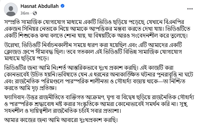 সামাজিক যোগাযোগমাধ্যমে ছড়িয়ে পড়া একটি আপত্তিকর ভিডিওকে কেন্দ্র করে নিঃশর্ত দুঃখ প্রকাশ করেছেন এনসিপি নেতা ও জাতীয় সংসদ সদস্য হাসানত আবদুল্লাহ।