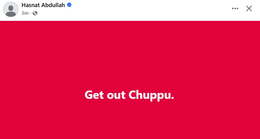 সংসদ থেকে বের হওয়ার পর বিকেল প্রায় ৪টার দিকে সামাজিক যোগাযোগমাধ্যম ফেসবুকে একটি সংক্ষিপ্ত স্ট্যাটাস দেন এনসিপির সংসদ সদস্য হাসনাত আব্দুল্লাহ। তিনি ইংরেজিতে মাত্র তিনটি শব্দ লিখেন— “Get out Chuppu.”