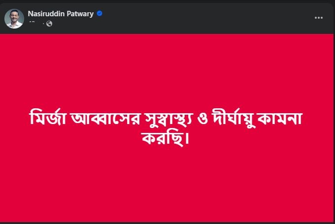 পোস্টে নাসীরুদ্দীন পাটওয়ারী লিখেছেন, ‘মির্জা আব্বাসের সুস্বাস্থ্য ও দীর্ঘায়ু কামনা করছি।’