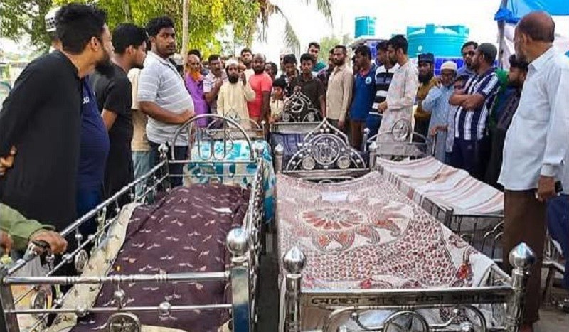 যে উঠানে আজ নতুন বউকে বরণ করে নেওয়ার কথা ছিল, সেই উঠানেই সারি সারি খাটিয়া। ফুল, আলোর সাজসজ্জা আর আনন্দ ধ্বনির বদলে সেখানে ছিল নিথর দেহ আর স্বজনদের বুকফাটা কান্না। একসঙ্গে পরিবারের ৯ সদস্যের মরদেহ দেখে স্তব্ধ হয়ে গেছে উপস্থিত মানুষজন।