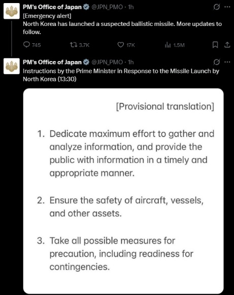 জাপানের সরকারি সম্প্রচারমাধ্যম এনএইচকে জানিয়েছে, উত্তর কোরিয়ার নিক্ষিপ্ত ব্যালিস্টিক ক্ষেপণাস্ত্রগুলো ইতোমধ্যে সমুদ্রে পতিত হয়েছে বলে ধারণা করা হচ্ছে। জাপানের প্রধানমন্ত্রীর অফিসিয়াল এক্স অ্যাকাউন্টেও উত্তর কোরিয়ার ব্যালিস্টিক ক্ষেপণাস্ত্র ছোড়ার বিষয়টি নিশ্চিত করা হয়েছে।