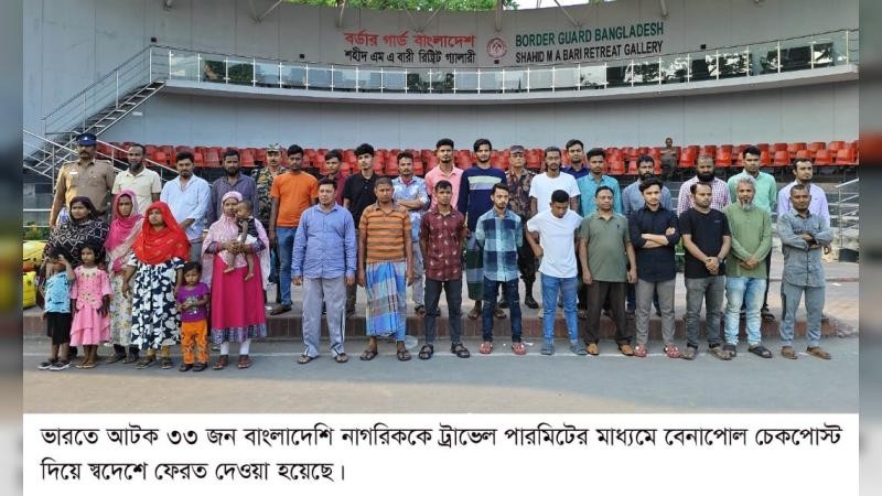 ভারতে আটক ৩৩ জন বাংলাদেশি নাগরিককে ট্রাভেল পারমিটের মাধ্যমে বেনাপোল চেকপোস্ট দিয়ে স্বদেশে ফেরত দেওয়া হয়েছে।