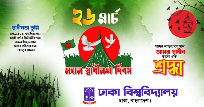 আগামী ২৬ মার্চ মহান স্বাধীনতা ও জাতীয় দিবস। দিবসটি উদযাপন উপলক্ষ্যে ঢাকা বিশ্ববিদ্যালয় (ঢাবি) কর্তৃপক্ষ নানা কর্মসূচি গ্রহণ করেছে। কর্মসূচির মধ্যে রয়েছে আলোচনা সভা, জাতীয় স্মৃতিসৌধে পুষ্পস্তবক অর্পণ, বিশেষ প্রার্থনা।
