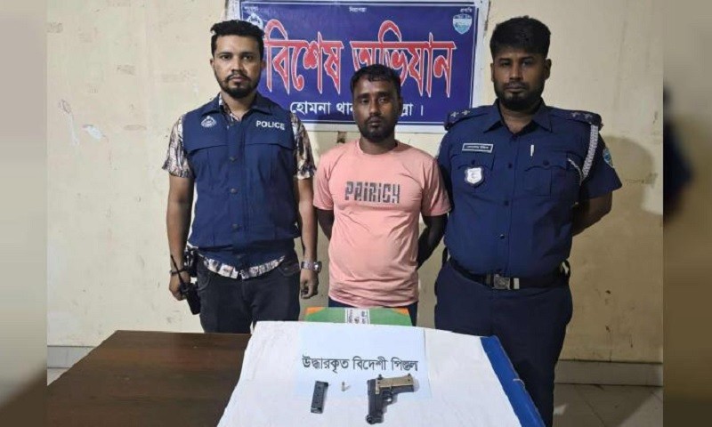 গতকাল মঙ্গলবার (৩১ মার্চ) গোপন সংবাদ পেয়ে হোমনা থানার এসআই মোছলেহ উদ্দিন ও এসআই আল আমিন সঙ্গীয় ফোর্স নিয়ে উপজেলার দুর্গাপুর গ্রামে অভিযান চালিয়ে তাকে গ্রেপ্তার করেন। পরে তার দেওয়া তথ্য অনুযায়ী তার কাছ থেকে ৭.৬৫ বিদেশি পিস্তল, ম্যাগাজিন ও এক রাউন্ড গুলি উদ্ধার করা হয়।