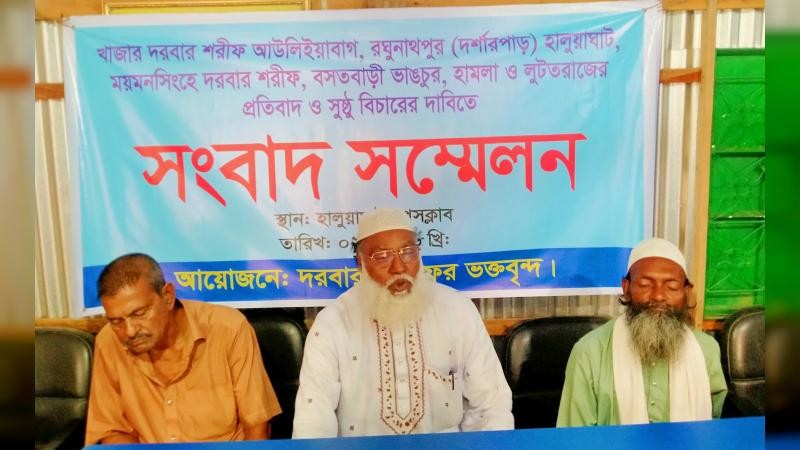 ময়মনসিংহের হালুয়াঘাট উপজেলার সদর ইউনিয়নের রঘুনাথপুর (দর্শারপাড়) এলাকার খাজার দরবার আউলিইয়াবাগ শরিফে হামলা, বসতবাড়ি ভাঙচুর ও লুটপাটের ঘটনার প্রতিবাদে সংবাদ সম্মেলন অনুষ্ঠিত হয়েছে। একই সঙ্গে এ ঘটনার সুষ্ঠু তদন্ত ও বিচার দাবি জানিয়েছেন ভুক্তভোগীরা।