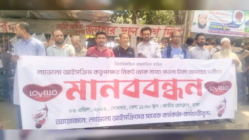 সোমবার (৬ এপ্রিল) জাতীয় প্রেসক্লাবের সামনে লাভেলো আইসক্রিম কর্তৃপক্ষের কাছ থেকে বকেয়া পাওনা আদায়ের লক্ষ্যে এক মানববন্ধনের আয়োজন করেন তৌফিকা গ্রুপ ও লাভেলো আইসক্রিম পিএলসি-এর সাবেক কর্মকর্তা ও কর্মচারীবৃন্দ।