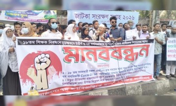 ১৮তম সনদধারী সকল প্রার্থীকে দ্রত সময়ের মধ্যে শূন্য পদ যুক্ত করে সরাসরি সুপারিশ/৭ম গণবিজ্ঞপ্তির মাধ্যমে নিয়োগের আওতায় নিয়ে আসার এই বিষয়টিকে সামনে রেখে আজ মঙ্গলবার (৭ এপ্রিল) জাতীয় প্রেসক্লাব, ঢাকায় ১৮তম শিক্ষক নিবন্ধনে চূড়ান্তভাবে উত্তীর্ণ ও ৭ম গণবিজ্ঞপ্তিতে সুপারিশ বঞ্চিত প্রার্থীরা এক বিশাল মানববন্ধনের আয়োজন করেন।