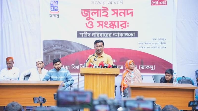 ঢাকা বিশ্ববিদ্যালয় কেন্দ্রীয় ছাত্র সংসদ (ডাকসু) আয়োজিত ‘জুলাই সনদ ও সংস্কার: শহীদ পরিবারের আকাঙ্খা’ শীর্ষক সংস্কার আলাপ অনুষ্ঠিত হয়েছে। সংলাপে অংশ নিয়ে জুলাই-আগস্টে শহীদ পরিবারের সদস্যরা সরকারের প্রতি জুলাই সনদ বাস্তবায়নের আহ্বান জানিয়েছে।