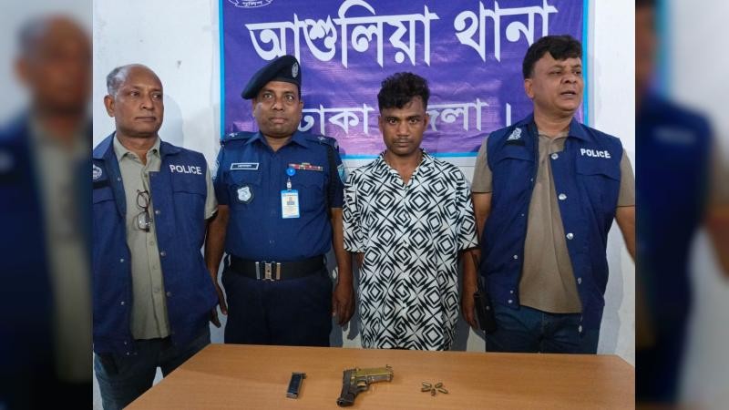 শিল্পাঞ্চল সাভারের আশুলিয়ায় প্রকাশ্যে গুলি করে টাকা ছিনতাইয়ের ঘটনায় রুবেল (৩৫) নামে এক ব্যক্তিকে গ্রেপ্তার করেছে পুলিশ। এসময় তার দেহ তল্লাশি করে একটি এমএম পিস্তল, একটি ম্যাগাজিন ও ৫ রাউন্ড গুলি উদ্ধার করা হয়।