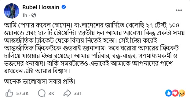 আজ বুধবার (১৫ এপ্রিল) সামাজিক যোগাযোগমাধ্যমে অবসরের ঘোষণা দেন রুবেল। ফেসবুকে তিনি লেখেন, 'আমি পেসার রুবেল হোসেন। বাংলাদেশের জার্সিতে খেলেছি ২৭ টেস্ট, ১০৪ ওয়ানডে এবং ২৮ টি-টোয়েন্টি। জাতীয় দল আমার আবেগ। কিন্তু একটা সময় আন্তর্জাতিক ক্রিকেট থেকে বিদায় নিতেই হতো। সেই চিন্তা করেই আন্তর্জাতিক ক্রিকেটকে গুডবাই জানালাম।'
