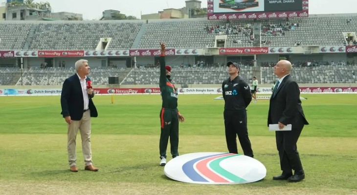 মিরপুর শের-ই বাংলা জাতীয় ক্রিকেট স্টেডিয়ামে তিন ম্যাচ সিরিজের প্রথম ওয়ানডেতে টস জিতে ব্যাট করার সিদ্ধান্ত নিয়েছেন নিউজিল্যান্ডের অধিনায়ক টম লাথাম। ফলে কিছুক্ষণের মধ্যেই ফিল্ডিংয়ে নামবে স্বাগতিক বাংলাদেশ।