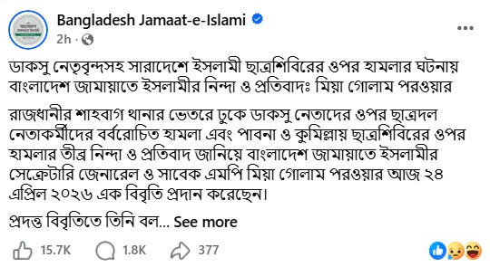 মিয়া গোলাম পরওয়ার বলেন, ঢাকা বিশ্ববিদ্যালয়ের মতো দেশের শীর্ষস্থানীয় বিদ্যাপীঠের শিক্ষার্থীদের নির্বাচিত প্রতিনিধিসহ পাবনার ঈশ্বরদী এবং কুমিল্লা পলিটেকনিক ইনস্টিটিউট ইসলামী ছাত্রশিবিরের ওপর এমন রাজনৈতিক প্রতিহিংসামূলক হামলা কোনোভাবেই কাম্য নয়। শিক্ষাঙ্গনে সব ছাত্র সংগঠনের সহাবস্থান নিশ্চিত করা এবং শিক্ষার সুষ্ঠু পরিবেশ সমুন্নত রাখা অত্যন্ত জরুরি। ছাত্রদের জানমালের নিরাপত্তা এবং শিক্ষার সুষ্ঠু পরিবেশ বিঘ্নিত করার যেকোনো অপচেষ্টা রুখে দিতে দেশের সচেতন ছাত্রসমাজ ও প্রশাসনকে সজাগ থাকতে হবে। কিন্তু আমরা উদ্বেগের সাথে লক্ষ্য করছি যে, ছাত্রদল শিষ্টাচার লঙ্ঘন করে সহিংসতাকে উসকে দিচ্ছে।