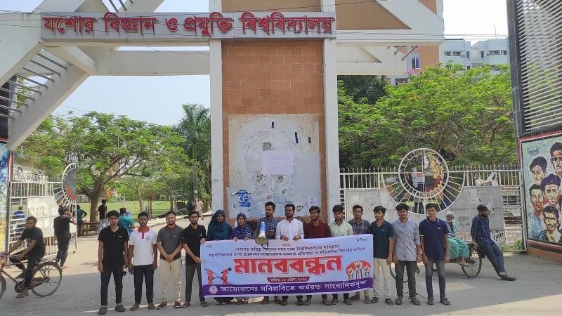 পেশাগত দায়িত্ব পালনকালে ঢাকা বিশ্ববিদ্যালয়ে কর্মরত সাংবাদিকদের ওপর ছাত্রদলের হামলার প্রতিবাদে মানববন্ধন করেছে যশোর বিজ্ঞান ও প্রযুক্তি বিশ্ববিদ্যালয়ে কর্মরত সাংবাদিকবৃন্দ। এসময় হামলাকারীদের দৃষ্টান্তমূলক শাস্তি, গণমাধ্যম কর্মীদের নিরাপত্তা ও স্বাধীন সাংবাদিকতার পরিবেশ নিশ্চিতের দাবি জানান তাঁরা।