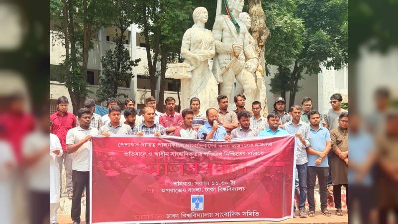 কর্মসূচিতে অংশ নিয়ে ঢাকা সাংবাদিক ইউনিয়নের সভাপতি শহিদুল ইসলাম বলেন, ‘যারা সেদিন ঢাকা বিশ্ববিদ্যালয় সাংবাদিক সমিতির সদস্যদের ওপর নির্বিচারে হামলা চালিয়েছে, নির্যাতন করেছে, তাদের অবিলম্বে আইনের আওতায় এনে শাস্তি নিশ্চিত করতে হবে। এটি যদি করা না হয়, তাহলে আমি মনে করব, সাংবাদিকদের কাজের পরিবেশ বিগত ১৭ বছরে যেভাবে অধিকারবঞ্চিত হয়েছে, সাংবাদিক সমাজ যেভাবে নির্যাতিত-নিষ্পেষিত হয়েছে, আবার সে পথে যদি এই সরকার হাঁটতে চায়, তাহলে আমরা যে গণতন্ত্রের স্বপ্ন দেখেছিলাম, আমরা যে গণমাধ্যমের স্বাধীনতার স্বপ্ন দেখেছিলাম, সে স্বপ্ন স্বপ্নই থেকে যাবে এবং এই সরকার আবার নতুন রূপে ফ্যাসিবাদে আবির্ভূত হবে। এর পরিণতি খুব খারাপ।’