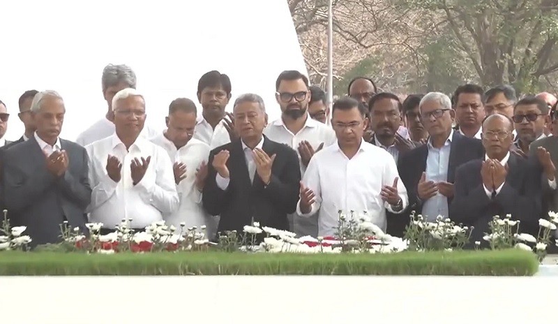 After paying his respects, he observed a minute of silence. Following this, Tareque Rahman, accompanied by his cabinet members, once again laid wreaths at the National Memorial to pay homage to the heroic martyrs of the Great Liberation War.